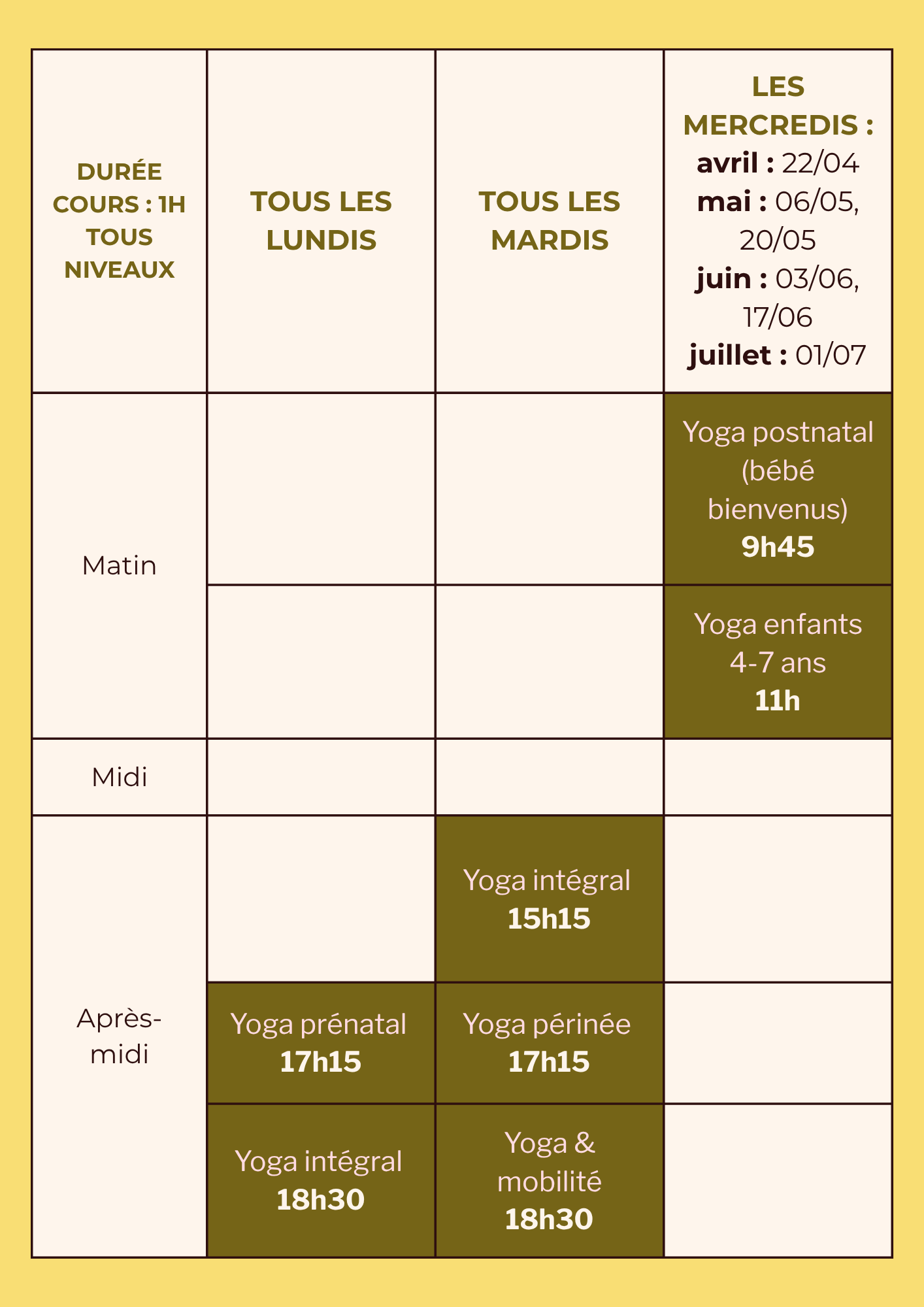 Je propose une programmation de cours de yoga pour tous et spécialisés pour les femmes.